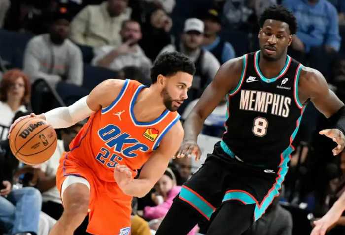 中段多特和维金斯连续拿分,雷霆一路追到只差12分,灰熊依靠小贾伦和韦尔斯稳定节奏,三节打完,灰熊94-81雷霆。决战第四节,杰威开始发力单打,肯威也续上三分球,雷霆终于追到个位数分差,科沃德连续强攻止血,双方维持10分左右陷入胶着。最后5分钟,维金斯和米切尔带队一路追到只差6分,米切尔追身三分再中,肯威三分球反超!最后时刻,杰威对抗上篮不中,科沃德单打被卡鲁索大帽扇下,最终雷霆117-116击败灰熊,完成21分超级逆转!