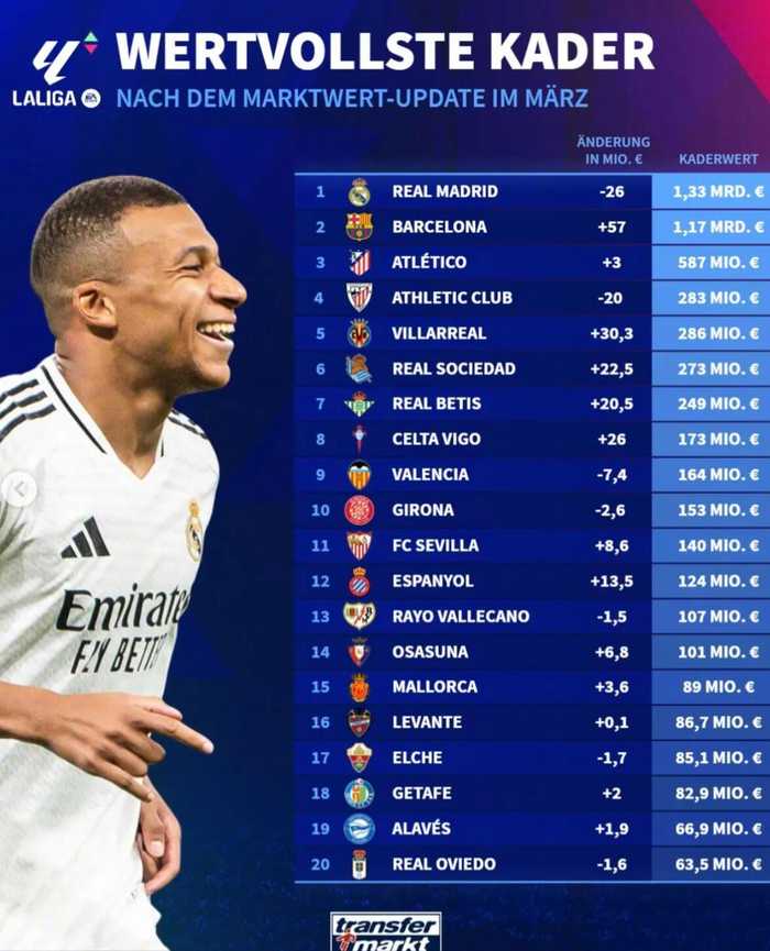 近期西甲球员身价更新之后,德转公布了西甲球队身价排行榜。