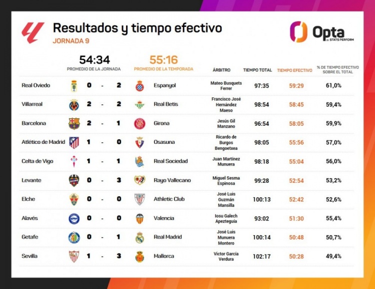 10月21日讯 OPTA统计了西甲第九轮各场比赛的有效时间,没有任何一场比赛的有效时间超过60分钟。