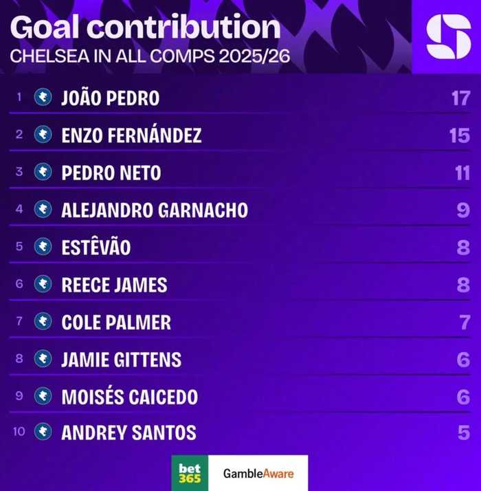 Squawka统计了切尔西本赛季的队内参与进球榜,详情如下: