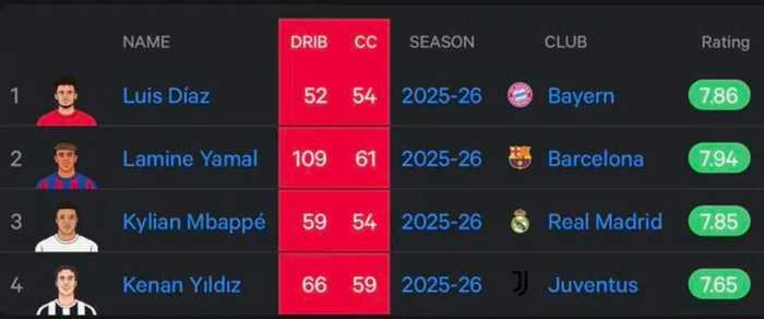 Statmuse数据统计,在本赛季欧洲五大联赛中,能够同时达成50次以上过人成功和创造50次以上机会的有以下四位球员: